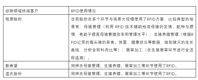 猪肉养殖企业集中度比较高,养殖规模都比较大,相比之下,牛羊的养殖会分散很多,所以生猪养殖是RFID最主要的动物应用场景,我们只是罗列了其中头部的几个生猪养殖企业,事实上,还有很多第二梯队的生猪养殖企业也在积极使用RFID标签。