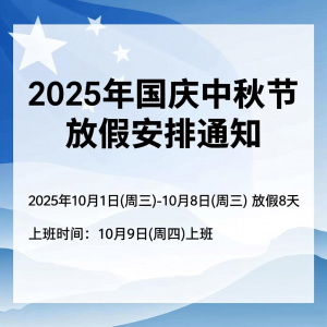 放假时间:2025年10月1日(周三)-10月8日(周三)放假8天