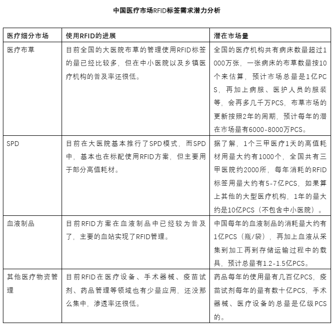 其他医疗资产:包括医疗设备、手术器械、药品、疫苗、试剂等各类医疗资产,目前RFID已经在这些场景中有一定的应用,但还不成规模,如果某个细分场景量大了之后,也可以独立进行分析。