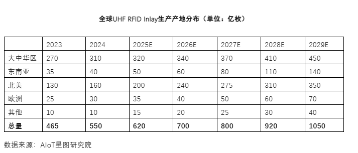 数据说明:1、产量数据是实际出货量的数据,并不代表产能,对于一个企业来说,产能肯定会大于实际的出货量,但不同的企业产能的利用率表现不太一样,头部的大企业产能的利用率比较高。2、本数据的统计口径是:按照工厂的所在地统计,比如艾利在中国的工厂产量统计就归纳为大中华区。3、根据我们调研到的信息,北美地区,尤其是墨西哥的RFID Inlay产能在最近几年增长很快,而且受益于北美大项目的落地,预计未来几年北美地区RFID Inlay工厂的出货量将会持续增加。4、东南亚地区的工厂在未来几年预计RFID Inlay总量会逐渐增加,尤其是越南与马来西亚这两个国家的工厂值得关注。5、中国以及港澳台地区的RFID Inlay工厂目前产能扩张速度已经降低了很多,虽然这些工厂的总出货量依然保持着一定的增速,主要原因是产能的利用率会逐渐增加,当然,不排除中国市场有大项目的落地,会在短期内刺激需求量的提升,我们会实时关注产业动态,如有进展,会及时更新。6、其他的地区中,我们虽然看到了头部的Inlay厂商在印度、巴西等国家与地区设厂,但整体的产量还比较小,未来我们也预计保持一定的增长稳定增长。
